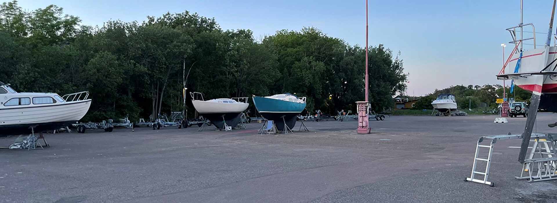 Vid Hinsholmens fritidsbåtshamn i utkanten av Göteborg står fortfarande många båtar på land. De ligger i rader och några väntar på att snart få segla ut i skärgården, andra är så nedgångna att det ska dröja innan de sjösätts.