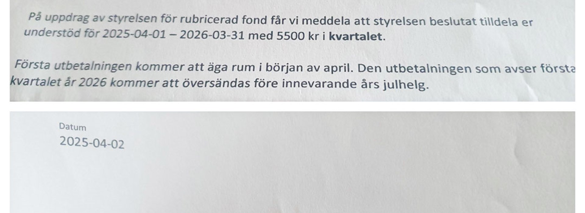 I slutet av mars fick en kvinna som vi kan kalla Sara beskedet att hon beviljats 5 500 kronor i kvartalet under ett års tid. Det fanns ett datum för utbetalning till hennes konto, hon kollade numret, allt stämde. Eftersom hon lever på marginalen, betydde beskedet ett års andrum från det dagliga vändandet på varje krona.