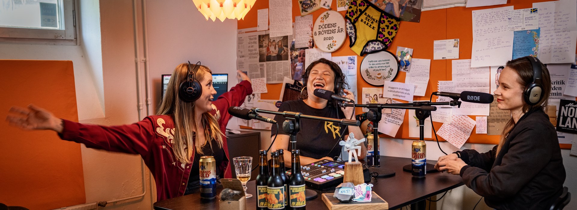 Du ser inte att de sitter där, trots stora fönster ut mot gatan, för lokalen är utformad lite som en tunnel. Längst in sitter trion i poddfabriken Flashback Forever på varsin barstol, antagligen med varsin öl, runt ett bord med uppställda mikrofoner. Det vill säga, om det är fredag. För det är då Ina Lundström, Emma Sjöström Knyckare och ”Scroll-Mia” ägnar sig åt själva kärnverksamheten: praterierna. Här hänger också broderierna. På anslagstavlan, bland lappar, vykort, brev, pins, tidningsklipp och kalsonger, syns hälsningar i korsstygn från trogna lyssnare: ”Ursäkta. Förlåt. Jag menade inte att kränka eller ofreda.” ”Dödens & Rövens år 2020”, ”Varför inte vara tacksam för den semla man fått istället för att reta sig på att jag åt fem?” Budskap med koppling till vad som yttrats i den prisvinnande podden där trion söker svaren på livets stora frågor genom att ”dyka rätt ner i visdomens källa”. Det vill säga, Flashback forum, en samlingsplats för anonyma åsikter om precis allt. Och trion bakom Flashback Forever gör sitt för att leva upp till utfästelsen om att vara ”för evigt”. Har snart spelat in 100 avsnitt. Ett i veckan, i två år.