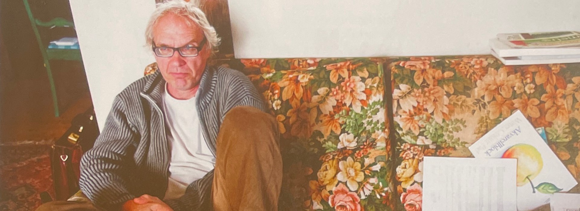 Sedan kryper en fortfarande barfota Lars Vilks upp i skräddarställning i sin blommiga tygsoffa bredvid en bunt tjocka pappersark, penslar och akvarellfärger.