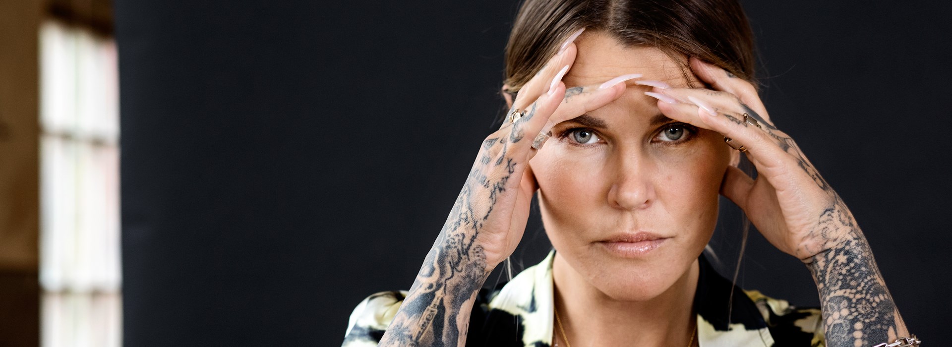 Det fanns en tid då Mia Skäringer ville bli ren och fin, lite som Anna i Solsidan. Öva bort sin dialekt och lasra bort tatueringarna. Hon började med den på högra armen. Men ångrade sig, och fyllde på istället. I dag är båda täckta, även händer och fingrar och rygg.