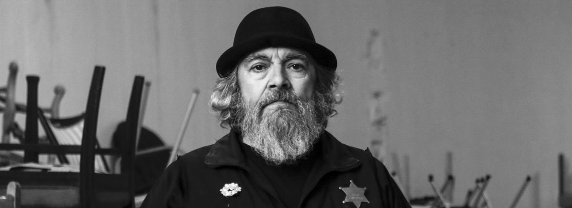 När han sitter i dörren på Reningsborgs Second Hand finns försäljarbrickan på bröstet, bredvid sheriffstjärnan.