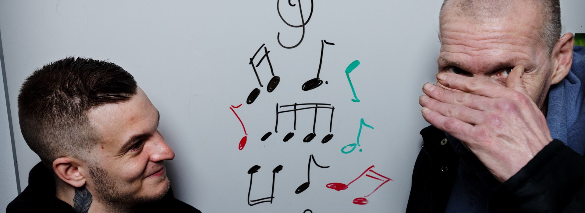 Pelle hinner knappt slå sig ner vid ett av borden på Faktums Malmökontor innan han vill spela en av brorsonen Dennis låtar, Hemlöshet.