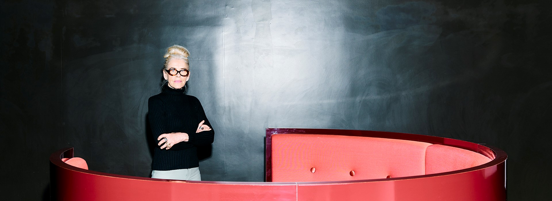 Ewa Fröling slår sig ned i en rund chockrosa soffa och vilar armarna på ryggstödet. Lite som om hon satt i en stor jacuzzi, fast utan vatten.